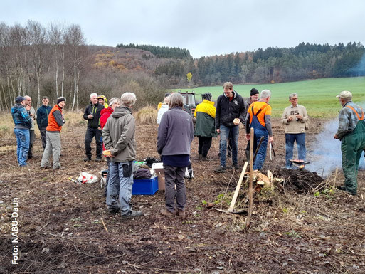 Nach der erfolgreichen Freistellungsaktion der NABU-Gruppe Daun zusammen mit Bürgern aus Mosbruch am Kopf des Mosbrucher Weihers werden die Arbeiten jetzt mehr in der Weihermitte fortgesetzt. Es geht wieder darum, die fortschreitende Verbuschung zu verringern. Die abgeschnittenen Sträucher werden wie stets an Ort und Stelle verbrannt.